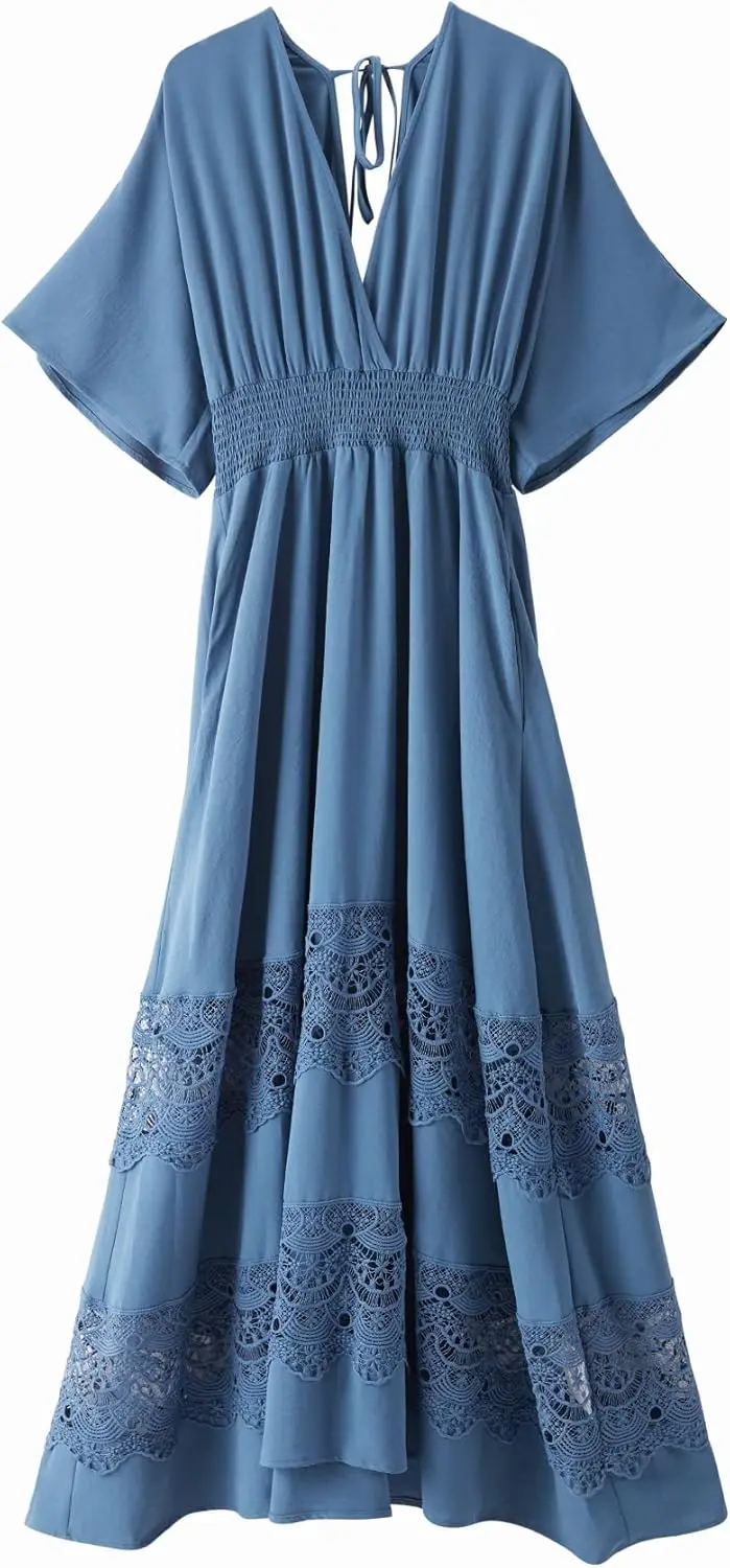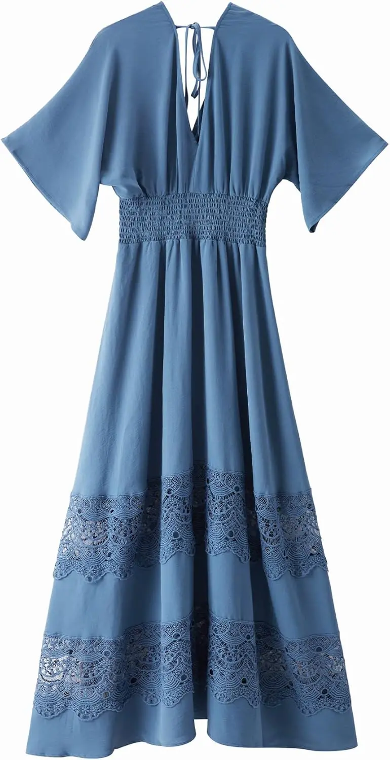 Summer Autumn Bohemian Chiffon Maxi Dress Short Sleeves V-Neck Casual Party Lace Decoration Smocked Waist Solid Pattern Washable